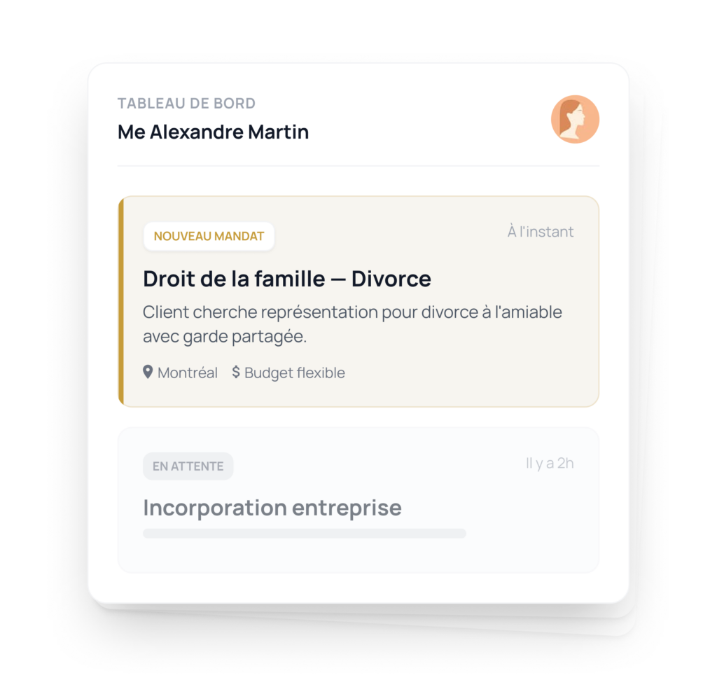 Notre algorithme analyse le domaine juridique, la région et le type de professionnel requis pour chaque demande. Seuls les professionnels dont le profil correspond sont notifiés et chaque membre du réseau a une chance égale de recevoir des mandats dans son champ d’expertise.